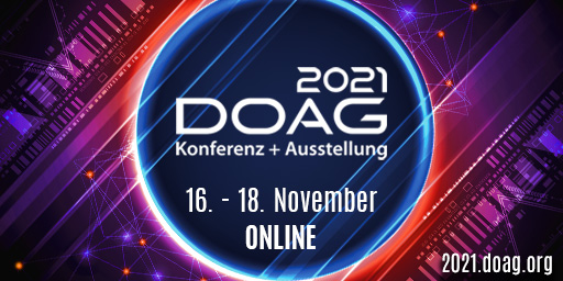 Heute endet der Frühbucherrabatt für die DOAG 2021 Konferenz + Ausstellung, die von Dienstag, den 16. November 2021 bis Donnerstag, den 18. November 2021 online stattfinden wird.